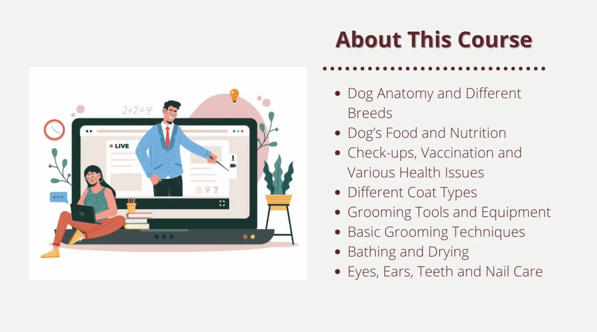 This course has no strict prerequisites, making it accessible to everyone. All that’s required is a love for animals, basic English literacy, and a willingness to learn. Prior experience in pet care is helpful but not mandatory, as this course covers everything from the basics to advanced topics.