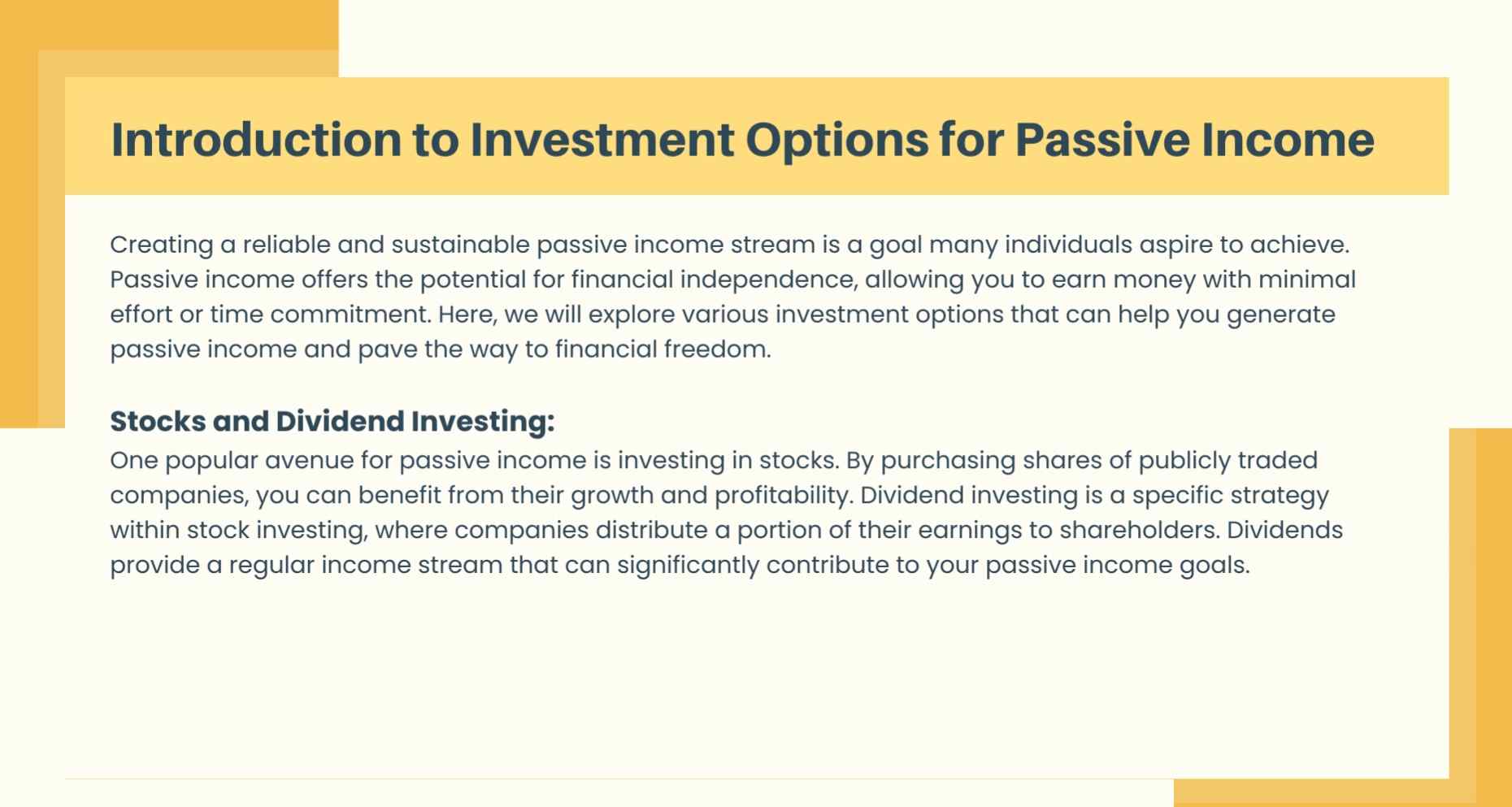 - Understand dividend income and the basics of stock investing for long-term gains.